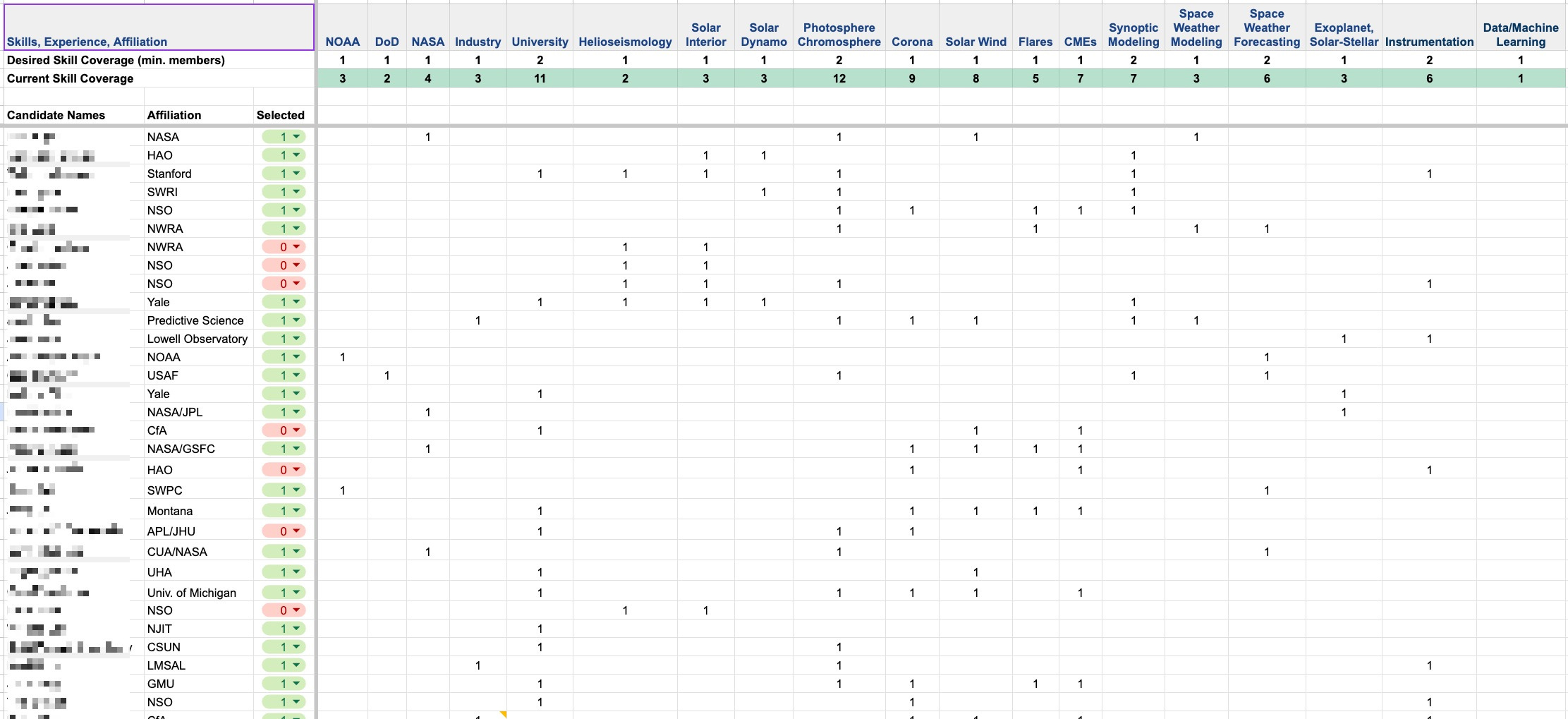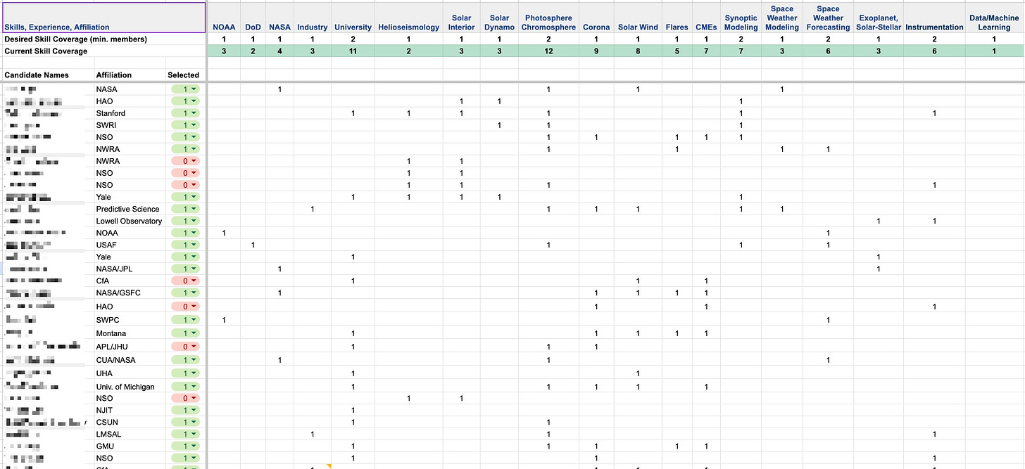 The challenge is that there are many excellent people who could serve on such a board. To bring discipline to selection, we built a composition matrix in Google Sheets and started by populating it with dozens of potential candidates drawn from our internal knowledge—capturing their affiliations, domains (solar interior, flares, synoptic modeling, instrumentation, machine learning, etc.), and sector (NOAA, DoD, NASA, universities, industry). We then held a working session with a partner institution, asking them to add names, refine expertise tags, flag conflicts, and suggest people to rule out for practical reasons (availability, overlapping roles, or organizational balance). The result is not the final SWG group, but a curated pool from which a future SWG chair can help down‑select to a balanced 10–12‑person committee.