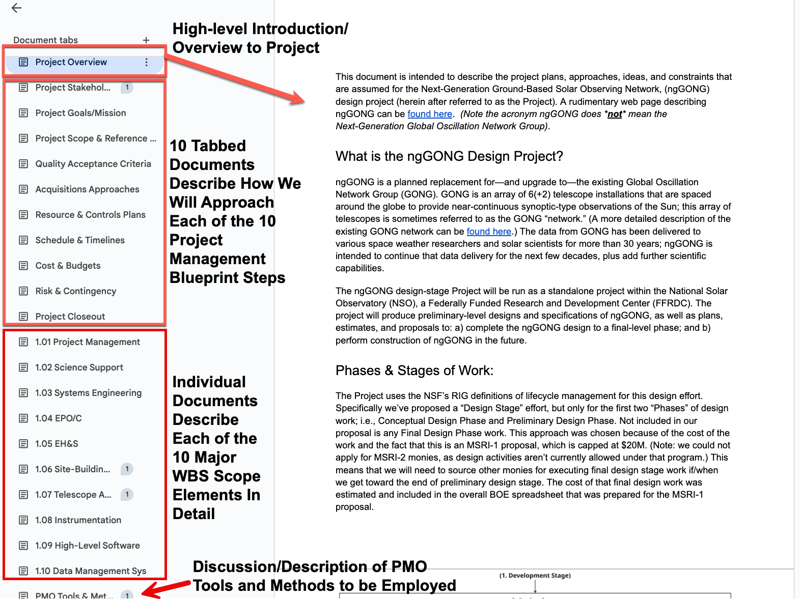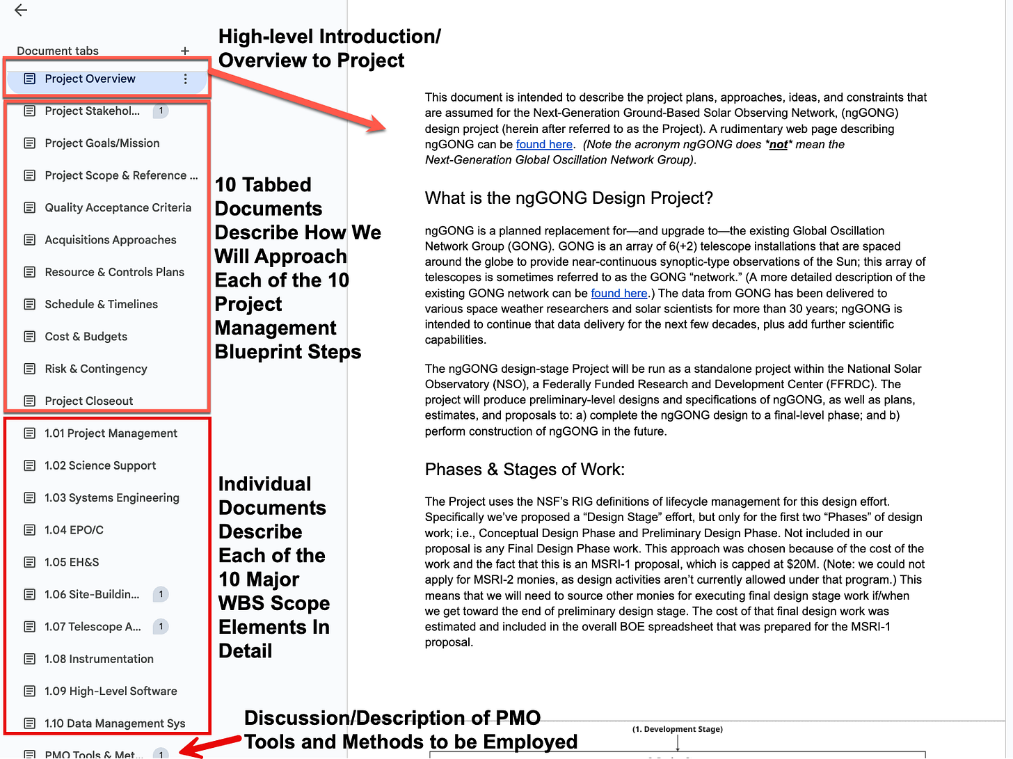 Project Execution Philosophy. This covers things like how we want to build on the success of GONG, the concept of “if it ain’t broke, don’t fix it… but if it is…” and even things about where the project will be headquartered (Boulder, CO).
