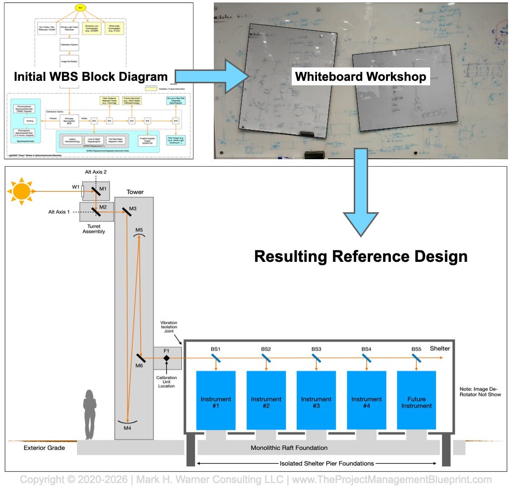 A reference design (also often called a “strawman” design), is a deliberately simple, system‑level representation of your project’s deliverables. Think of it as “cartoon architecture”: a handful of key blocks, with arrows showing how they connect, sit in space, and pass things like information, forces, or, with telescope design, light. It is not a polished CAD model or a detailed P&ID. It is a high‑level sketch that is “real enough” to ask tough questions of. In the blueprint, this sketch (or sketches) becomes the visual anchor that holds together everything from your scope statement, your requirements, and your work breakdown structure, to the management of stakeholder expectations.