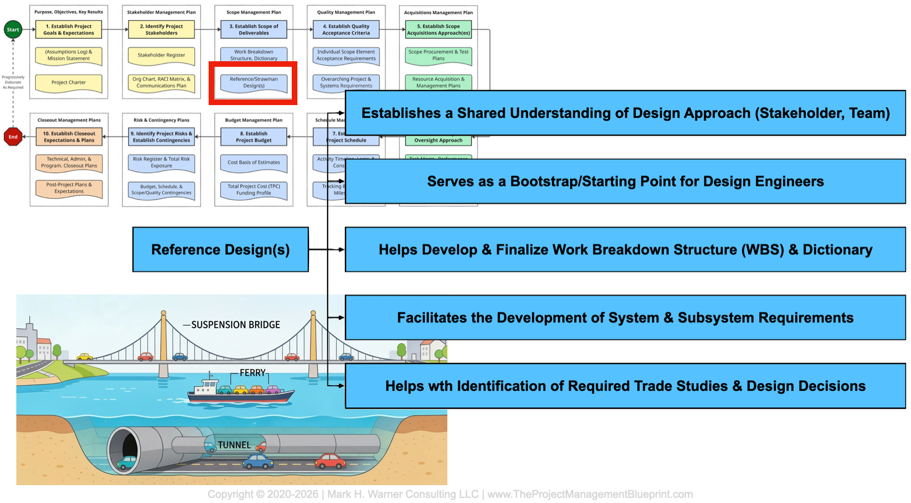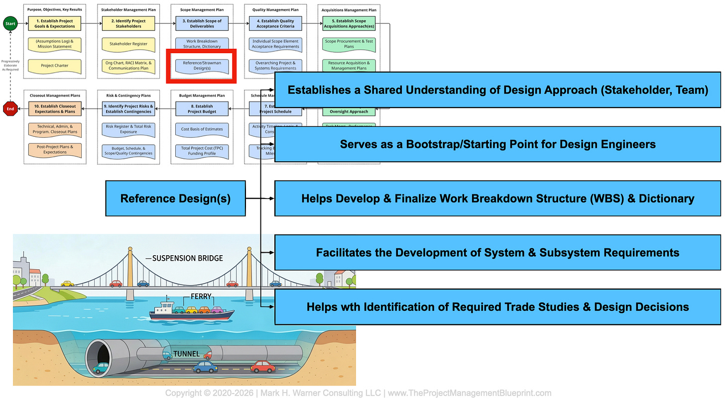 Creating a reference design is one of the most effective things you can do in Step 3 of the PM Blueprint. A simple, provisional sketch of the system forces clarity about what is in scope, what is out, and where the critical interfaces and trade‑offs lie. It keeps you from waking up halfway through “designing a bridge” only to discover that you should have been working on a tunnel. Early “cartoon architecture” can solve this issue, plus it forms a concrete basis for writing better requirements, planning trade studies between options, onboarding new team members with the project plans, and communicating with stakeholders in a shared visual language. Whether we’re sketching ngGONG’s opto‑mechanical layout, or the high‑level concept for getting vehicles across a river, the reference design is how we draw a line around our thoughts early enough that the whole team can see it, challenge it, and commit to building the same thing.