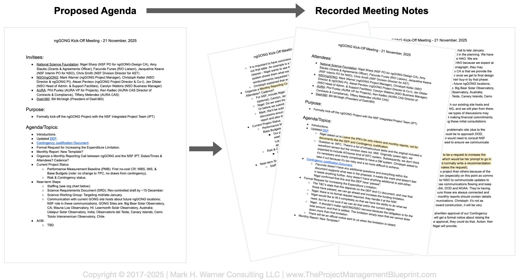 I was taught very early in my career a simple but absolute rule: never hold a meeting without an agenda. If a meeting isn’t important enough to warrant a few minutes of planning, it isn’t important enough to attend. Agendas are critical because they manage people’s expectations. When you send an agenda in advance, you are explicitly telling stakeholders who is coming, how long you need their attention, and exactly what you intend to discuss and/or achieve. This respects their time and sets a professional tone before the meeting even begins.