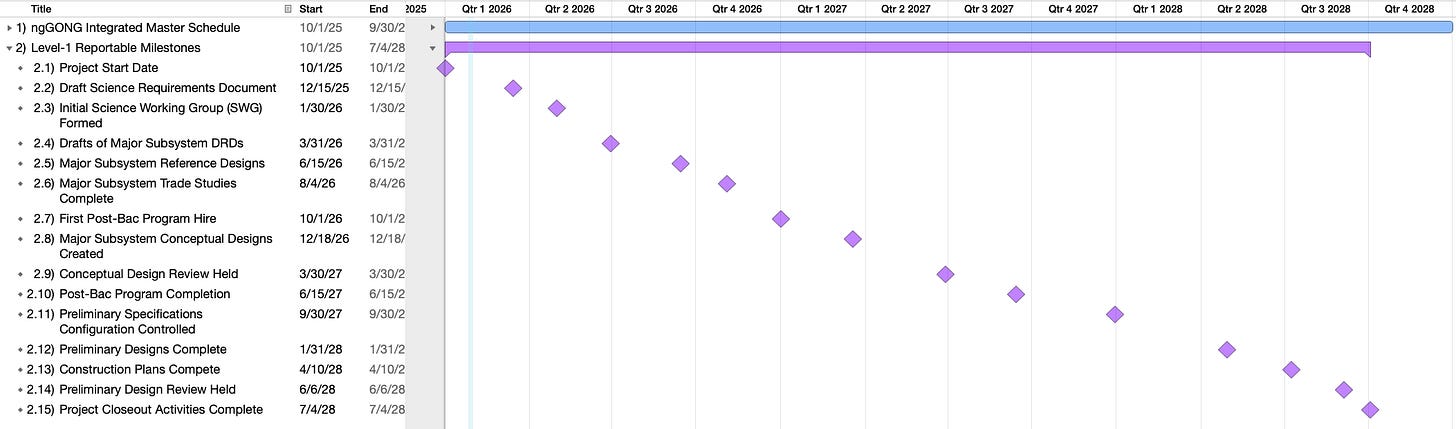 For a design project like ngGONG, typical Level-1 milestones include events such as completing major trade studies, finalizing high-level science requirements, forming key working groups, hiring critical team members, or passing formal design reviews like the Conceptual Design Review (CoDR) or Preliminary Design Review (PDR). For a traditional construction project, L1 milestones might be site groundbreaking, foundations poured, completion of the building shell, or the beneficial occupancy date. Every project is different, but they all have key points where meaningful progress is recognized; i.e., tangible achievements that move the project closer to its goal, and, just as importantly, let the key stakeholders know that the project is hitting its marks.