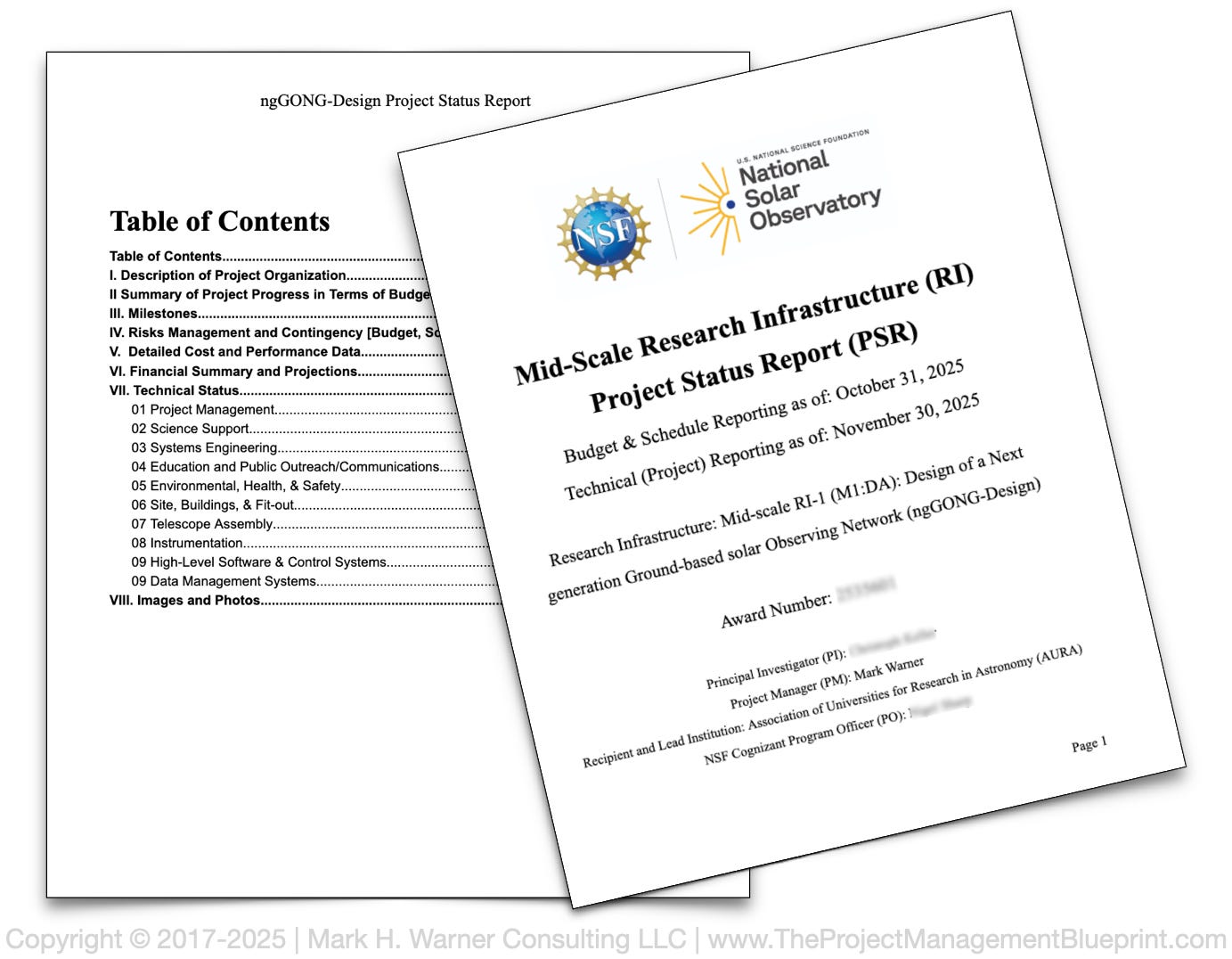 We started with externally imposed formats—the NSF reporting requirements—and treated them as the baseline. Then we extended them just enough for our project context: explicit contingency burn-down vs risk exposure, etc. Those extra sections give sponsors exactly what they need to act quickly, without hunting through narrative text.
