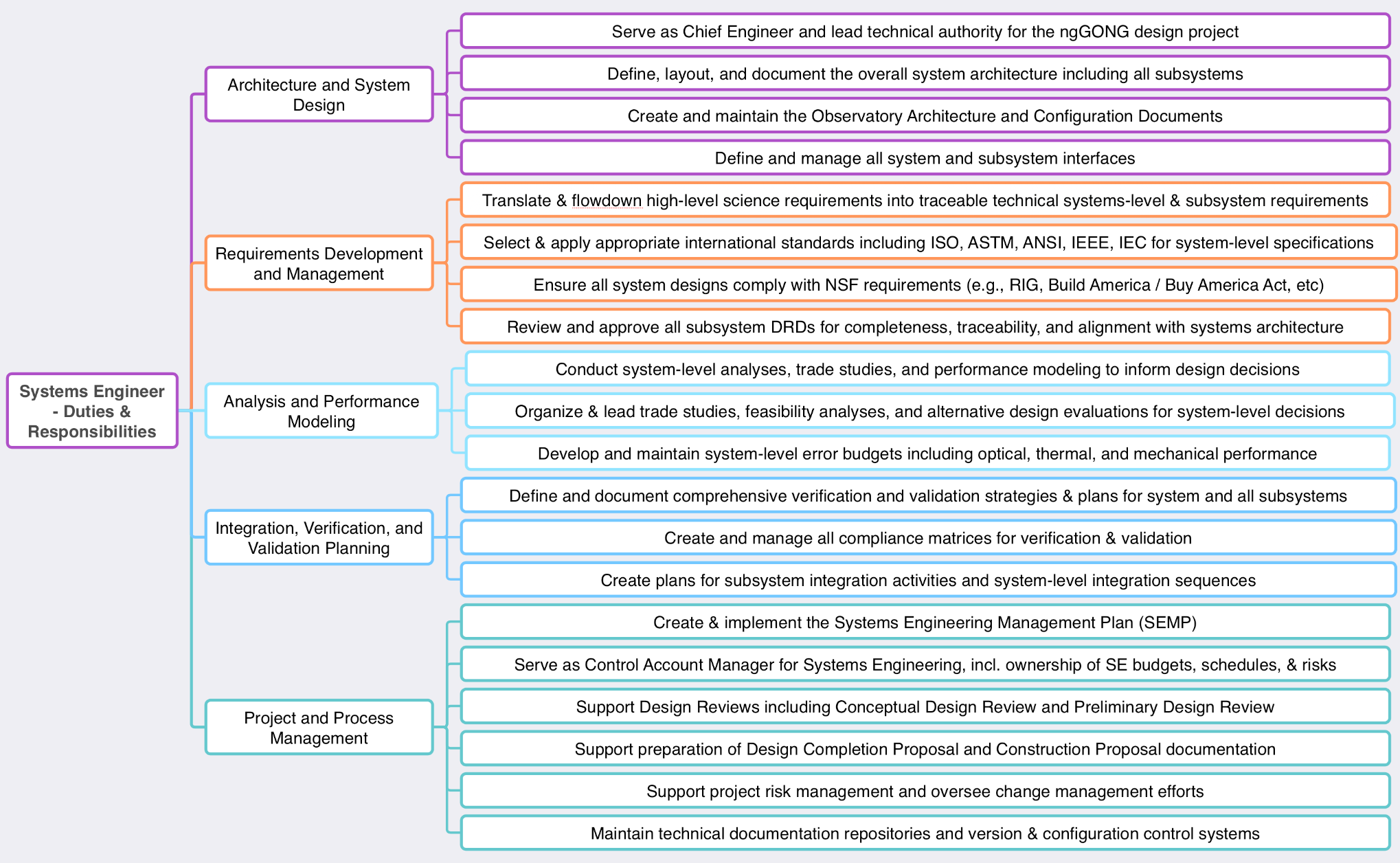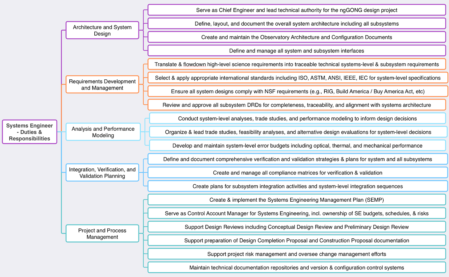 Think Deliverables. For an engineering position, I like to start with deliverables. I think through the things I want this person to create and/or provide during the project. These all get listed in a giant, unorganized list in the mind map; i.e., my first goal is to simply brain dump and capture my thoughts. For example, I’m currently working on the JD for our Systems Engineer, so I write down things like turning Science Requirements into Subsystem Requirements, creating Optical Error Budgets, producing a Description of our System Architecture, and establishing a list of System Interfaces. For positions like our Admin Assistant, I think of things like managing Travel Plans, creating Meeting Agendas & Notes, and fully organizing and hosting Design Reviews.